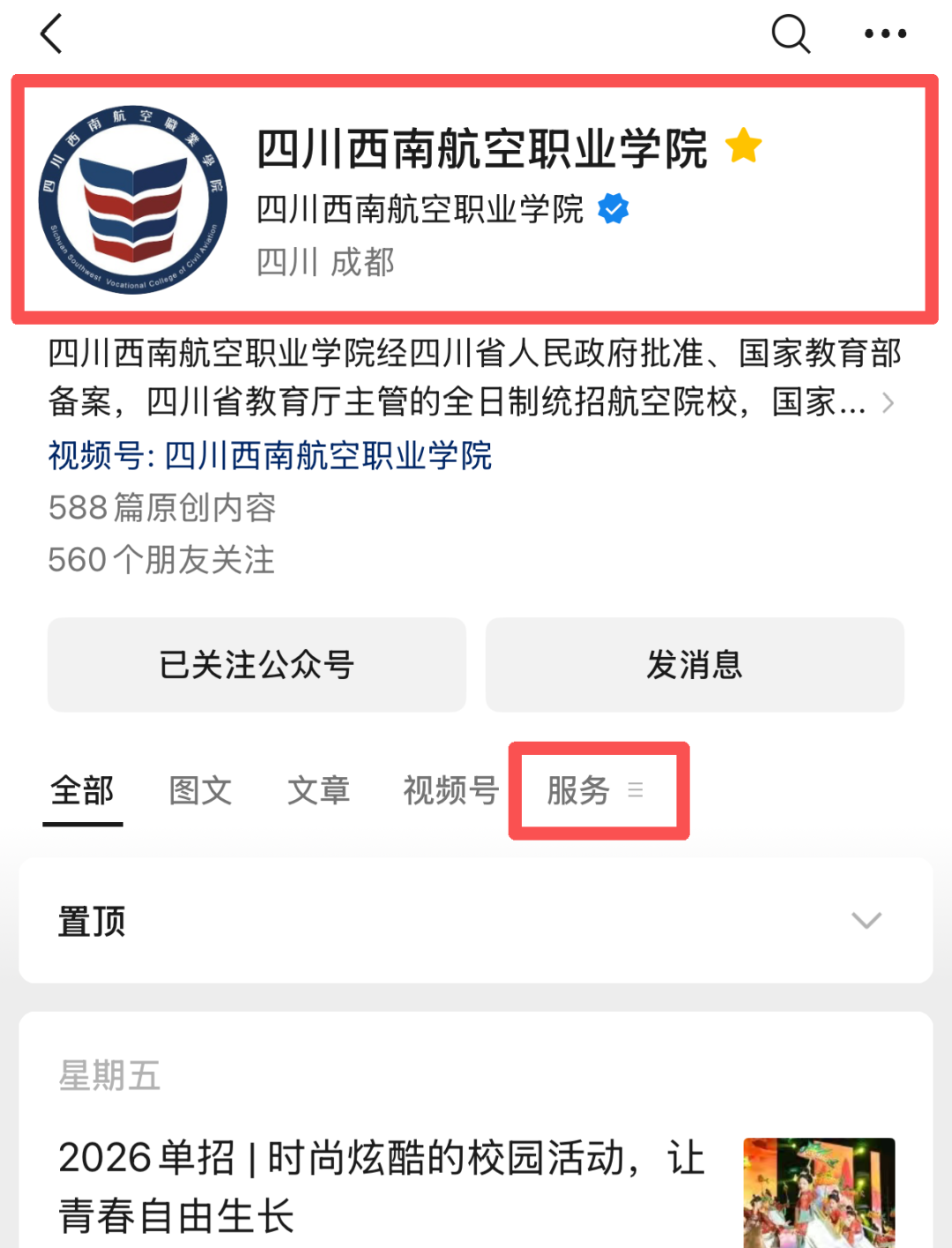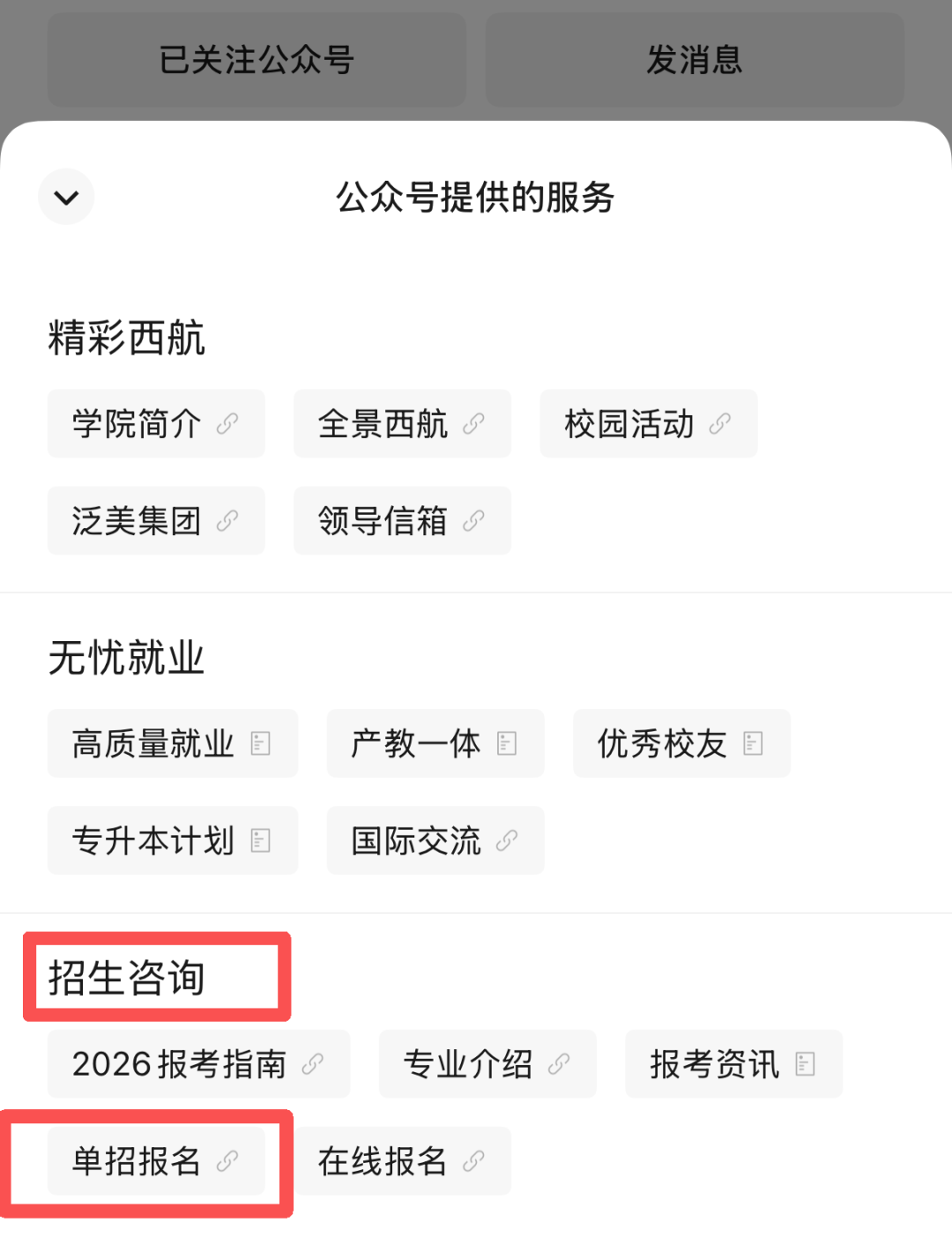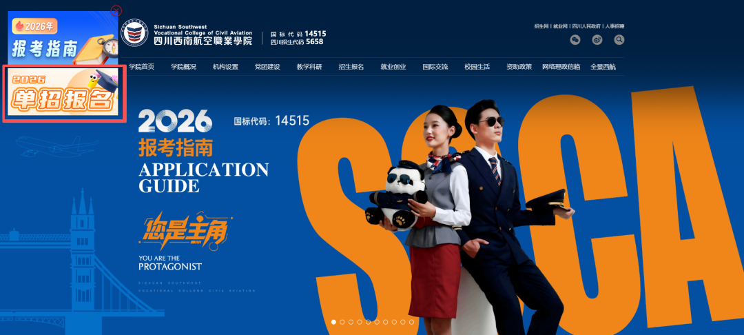 1、电脑登录“四川西南航空职业学院”官网(www.xnhkxy.edu.cn)点击“2026单招报名”飘窗或手机微信搜索“四川西南航空职业学院”公众号,点击标题栏最右侧“服务”,再下拉栏中选择“单招报名”跳转至四川省招生考试综合报名系统。