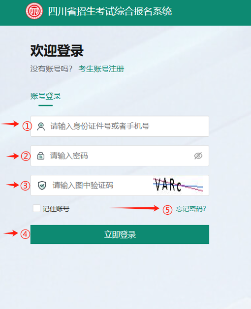 2、考生打开四川省招生考试综合报名系统首页,点击右上角“登录/注册”按钮,进入登录页面。依次在图1中标记①正确输入身份证件号或者手机号,在标记②正确输入密码,在标记③正确输入图中验证码,在标记④点击立即登录。若考生忘记密码可点击标记⑤“忘记密码?”,重置密码弹窗如图2所示。