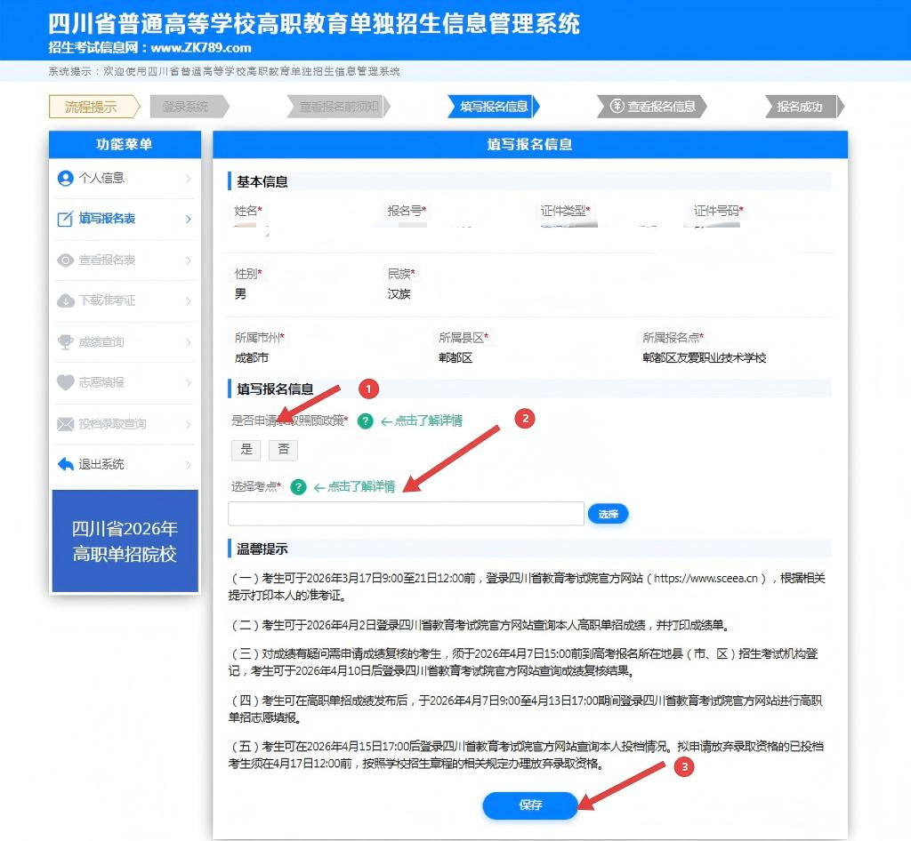 5、在图1中,点击标记①选择是否申请录取照顾政策,如果选择“是”会显示具体录取照顾政策项,考生根据实际情况进行勾选;点击标记②选择考点,会弹出选择报名考点弹窗如图2,点击标记③“保存”按钮,弹出填报信息确认弹窗如图3;