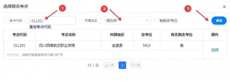 在图2中,可在标记①处填写四川西南航空职业学院考点代码(011201)或在标记②选择所属地区(金堂县),再点击标记③“查询”按钮,查询出四川西南航空职业学院考点,在目标考点的操作栏点击“选择”选中;