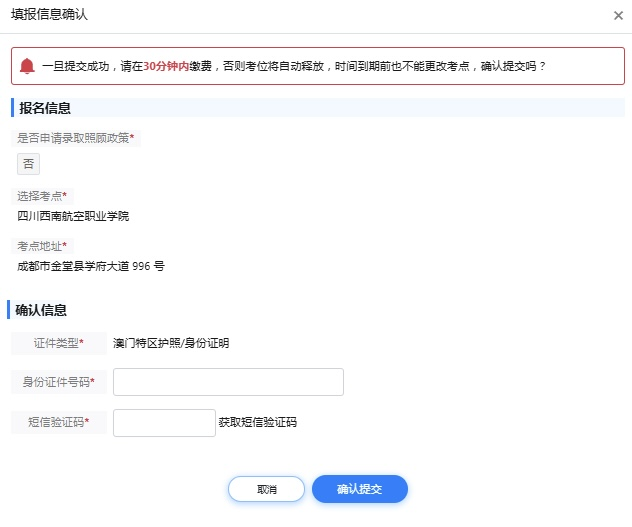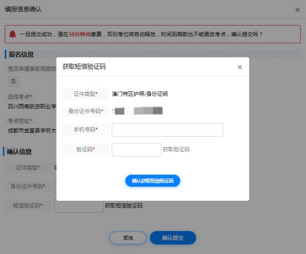 在填报信息确认弹窗即图3中输入身份证件号码和手机短信验证码,点击“确认提交”进行填报提交,进入报名后须知页面。
