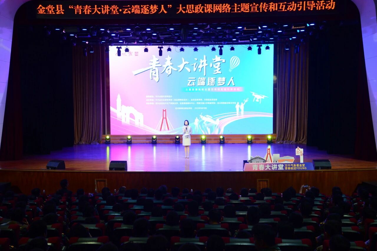 9月19日,成都市金堂县“青春大讲堂·云端逐梦人” 大思政课网络主题宣传和互动引导活动在四川西南航空职业学院顺利举行。本次活动邀请了红色宣讲员、“00后”通航企业负责人、非遗传承人、跨界教师等5位演讲嘉宾,围绕国防教育、家风传承、工匠精神、非遗传承、低空经济等主题进行了的精彩分享。来自金堂县级相关部门、属地高校师生600余人共享这场文化盛宴。