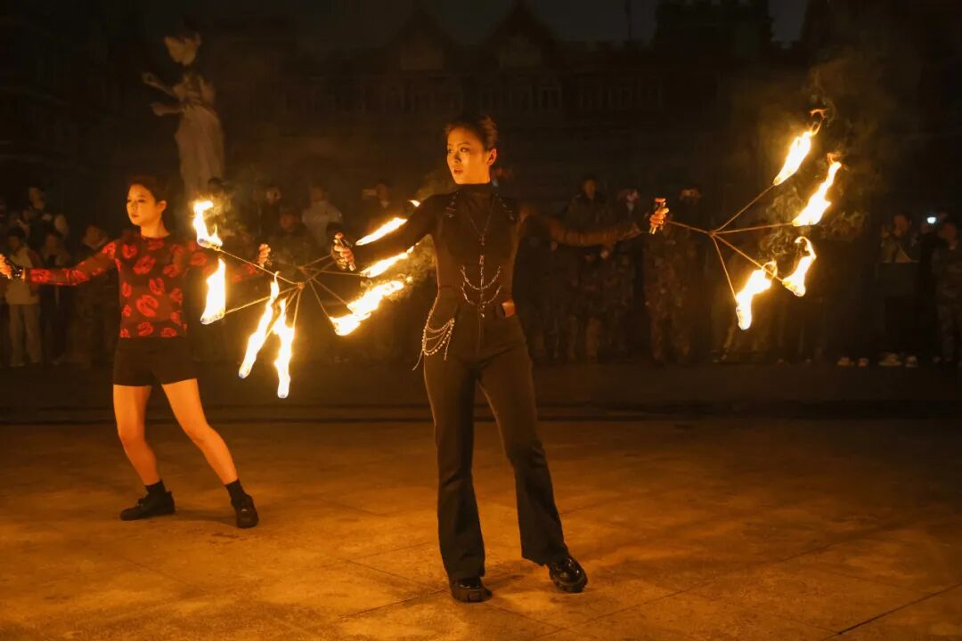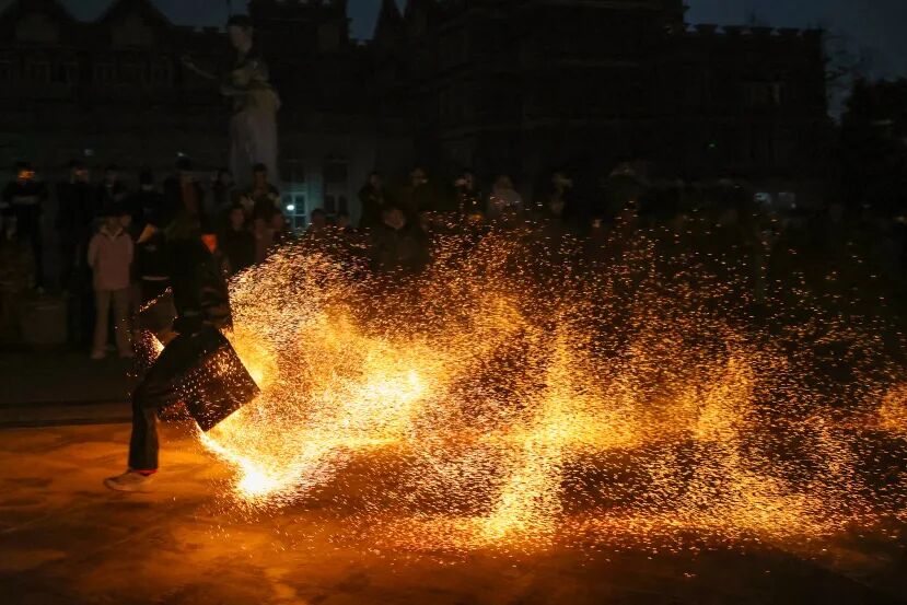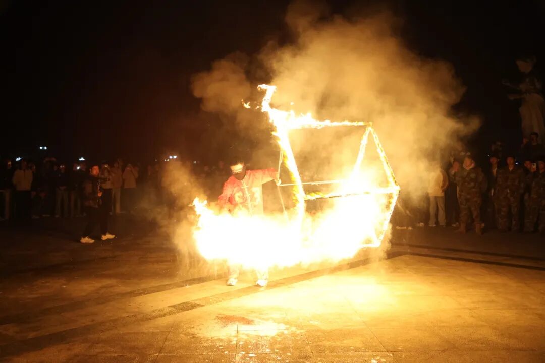 《焰舞迎新》非遗展示千年技艺点燃夜空,喷火表演烈焰冲天,气势如虹;火魔方流光转动,奇妙绚丽;火扇翻飞似蝶,柔中带刚;火壶舞动生风,炽热奔腾。火焰在夜空中交织绽放,仿佛千年技艺在此刻复活,瞬间点燃全场激情。线上线下观众同步屏息凝视,共同感受这场直击人心的火热盛宴。